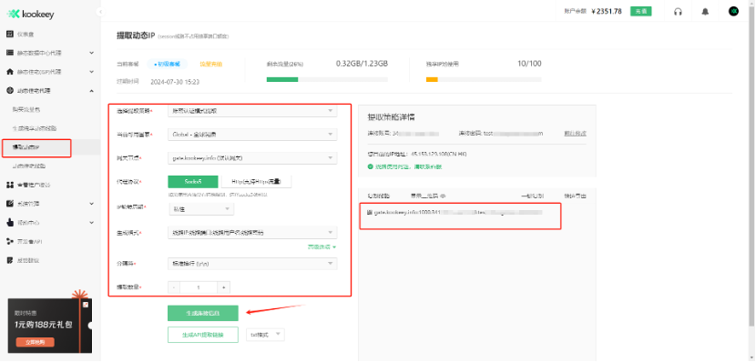 1、打開 動態(tài)住宅代理 -> 提取動態(tài)IP 界面,生成用于配置連接的主機、端口、賬號、連接密碼
