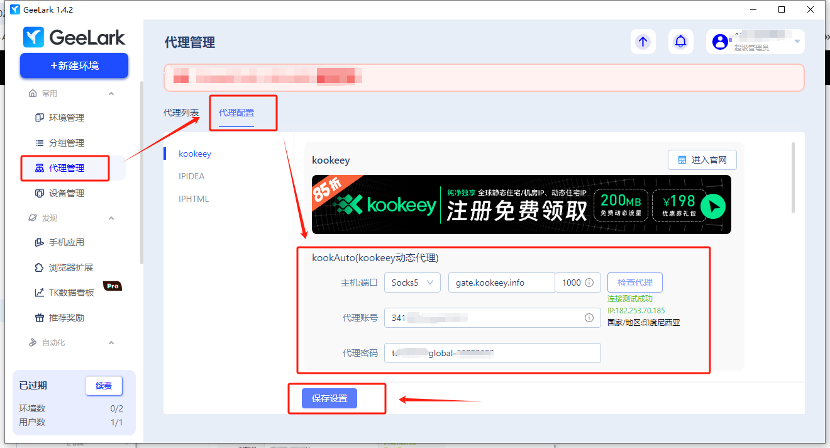 3、在 新建環(huán)境 > 代理設置 ,可在配置時選中kookeey(kookeey動態(tài)代理) 使用(無需重復填寫)