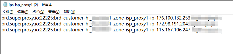 3.打開已下載TXT文件,可查看獲取的代理信息,每個代理信息均為:brd.superproxy.io 開頭,每一行信息是一個完整的代理信息,包括代理主機(jī)、代理端口、代理賬號和密碼。如下圖: