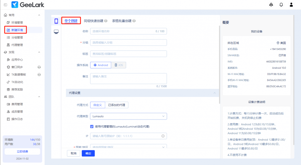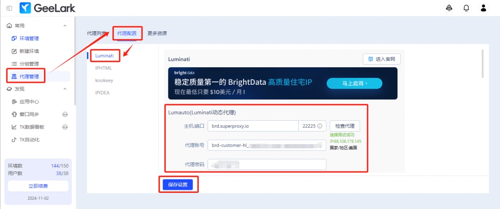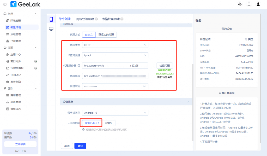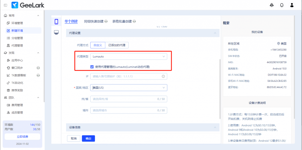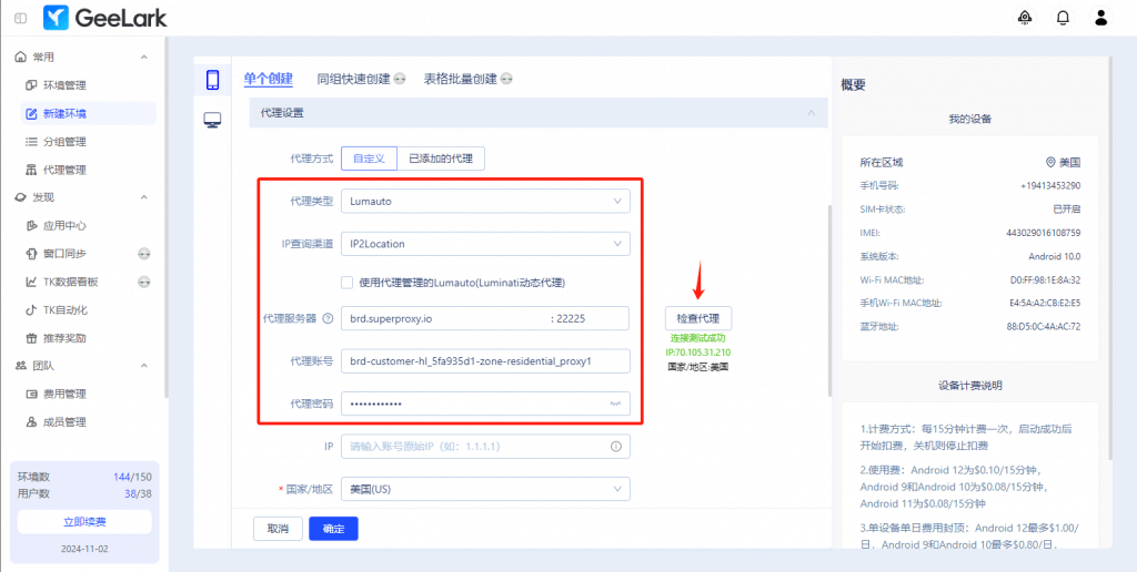 注:如果還未在GeeLark的【代理管理】頁面添加Luminati動態(tài)代理,則去掉勾選【使用代理管理的Lumauto(Luminati動態(tài)代理)】