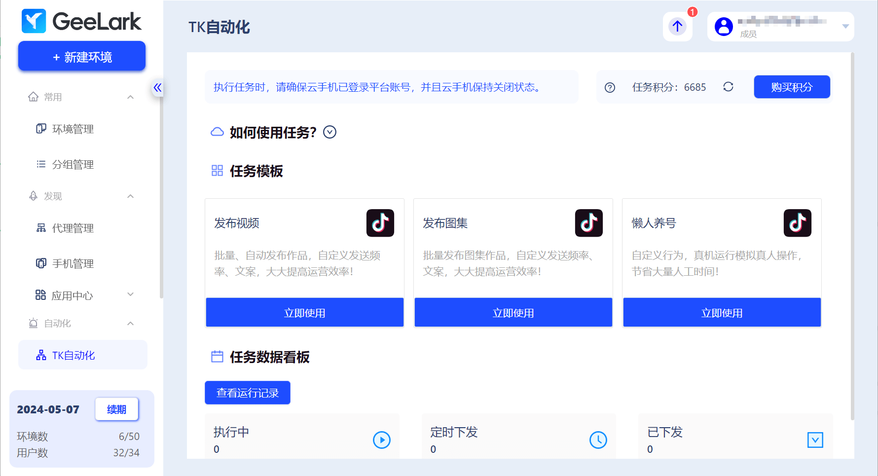 首先,在云手機平臺方面,GeeLark將為用戶提供一個安全、高效的運營環(huán)境。通過GeeLark云手機,用戶可以輕松管理其TikTok賬號,避免了因為設(shè)備問題導致的賬號風險。同時,GeeLark云手機還可以為用戶提供更加便捷的運營體驗,讓他們便捷地進行賬號管理和內(nèi)容發(fā)布。